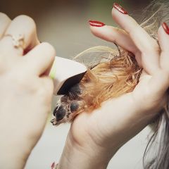 4. Нанесение спрея-антистатика, прочёсывание отмершего подшерстка с одновременным просушиванием каждой пряди шерсти питомца.